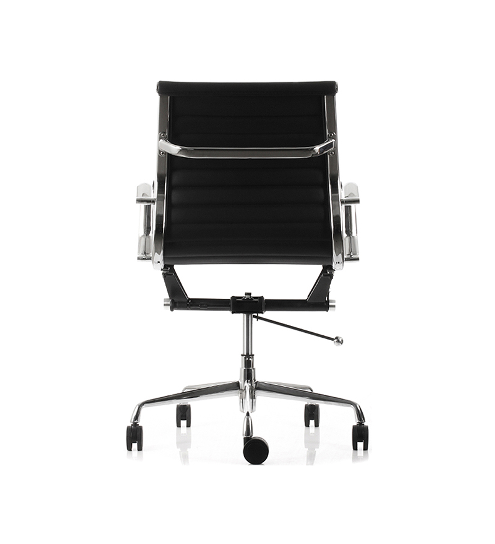 Silla en Kit tapizada en ecocuero negro, respaldo medio, brazos fijos cromados, mecanismo reclinable con regulación de tensión, regulación del altura del asiento y base cromada.