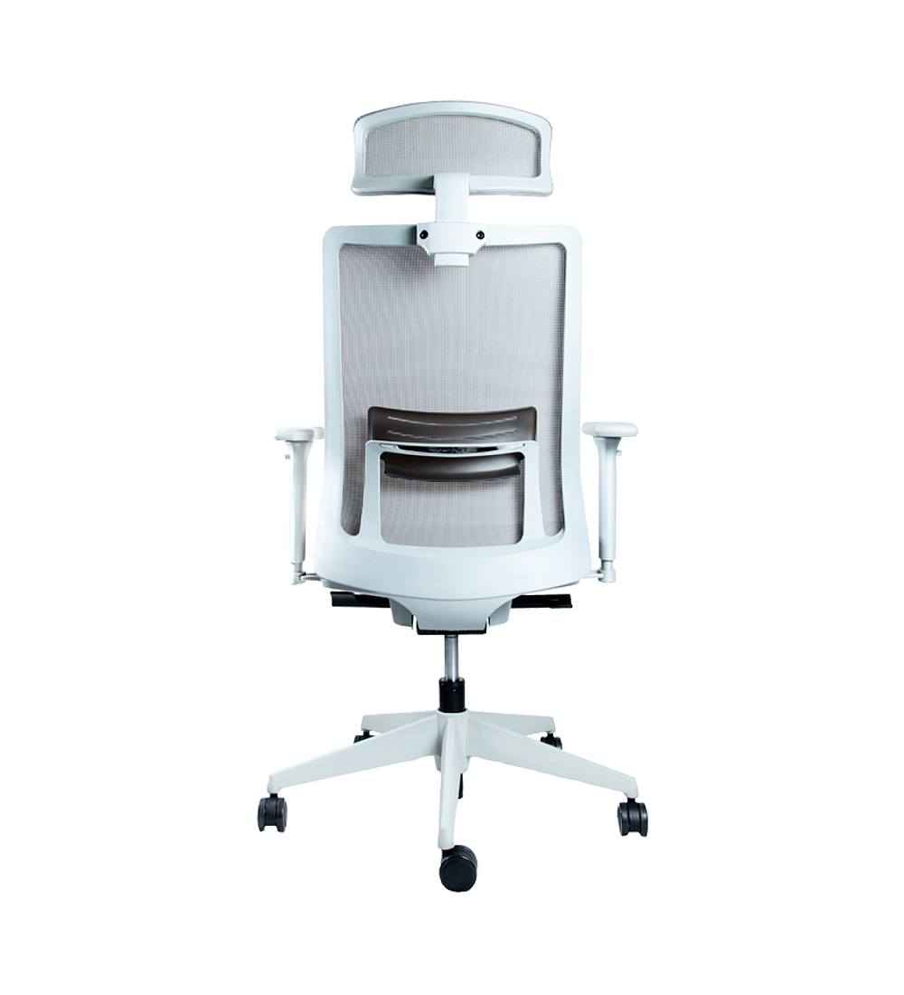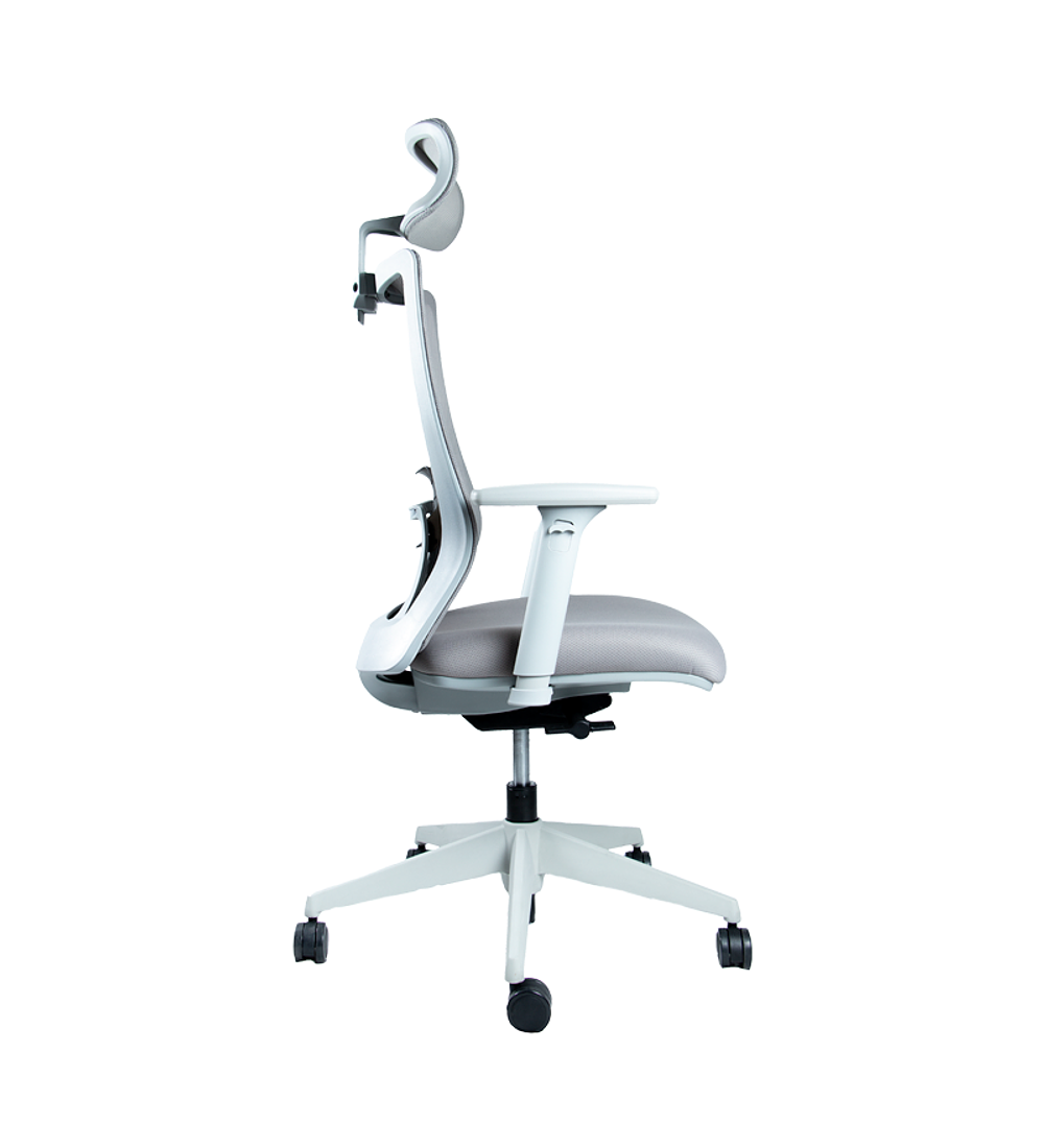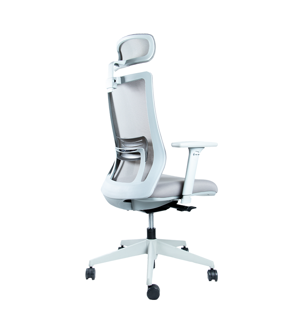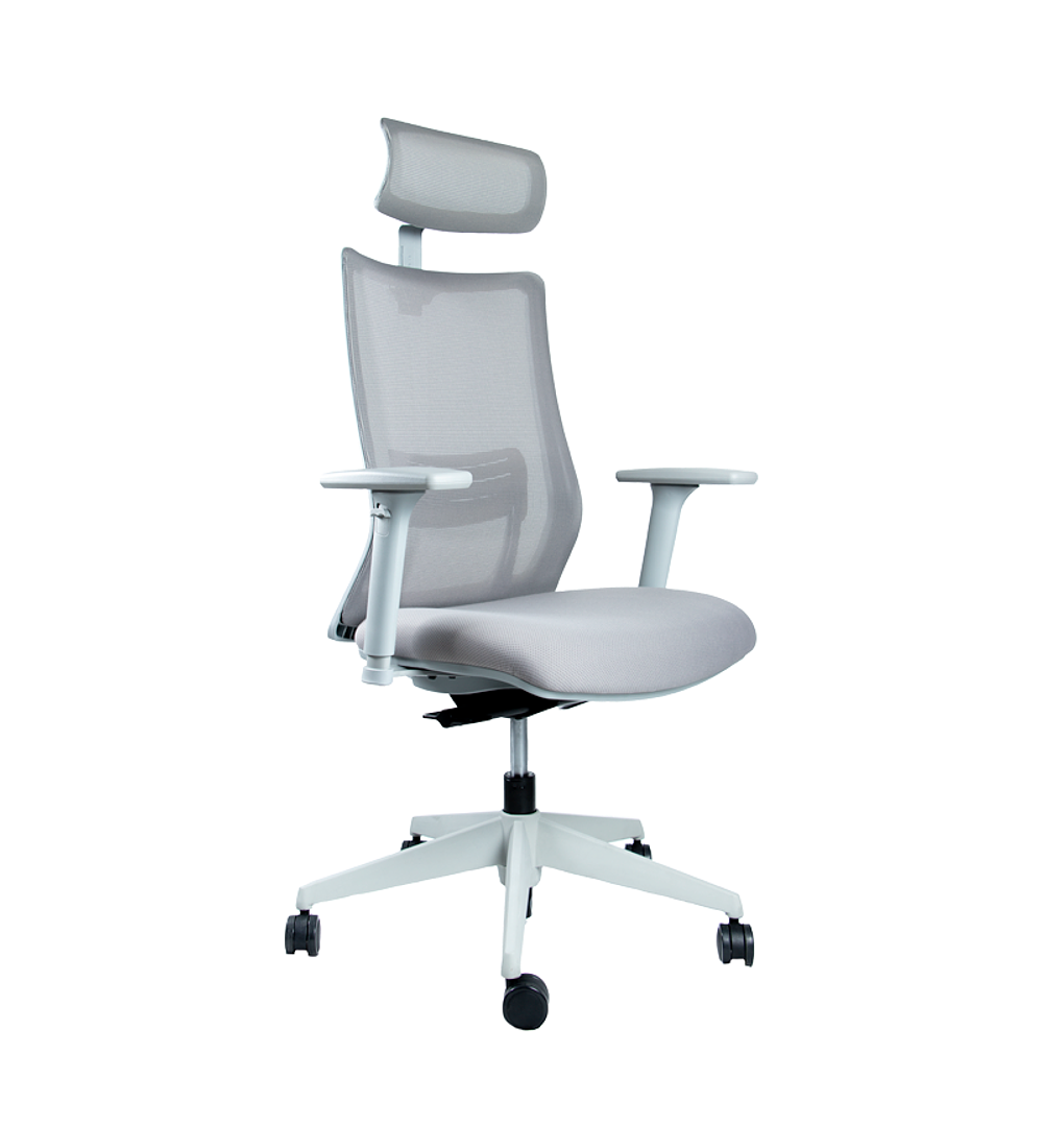 Silla ejecutiva de respaldo alto en malla de estructura gris, soporte lumbar con regulación de alturade 60 mm. Cabecero en malla regulable en altura con movimieto de 50 mm. Brazos regulables en 3D con cubierta PU. Mecanismo sincrónico autopensante multiblock. Asiento tapizado de espuma inyectada con desplazador de asiento. Base nylon y ruedas desmopan.