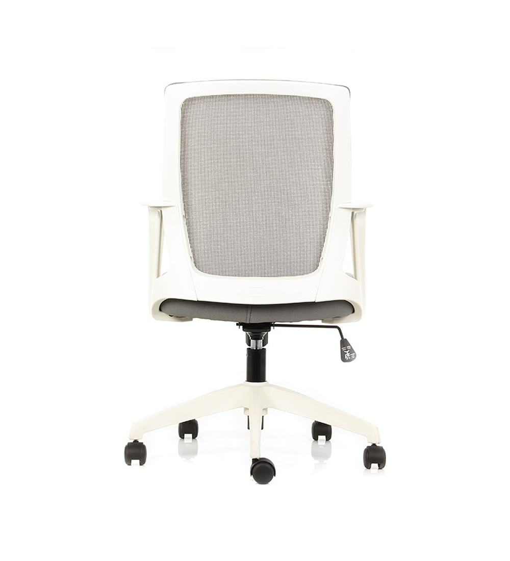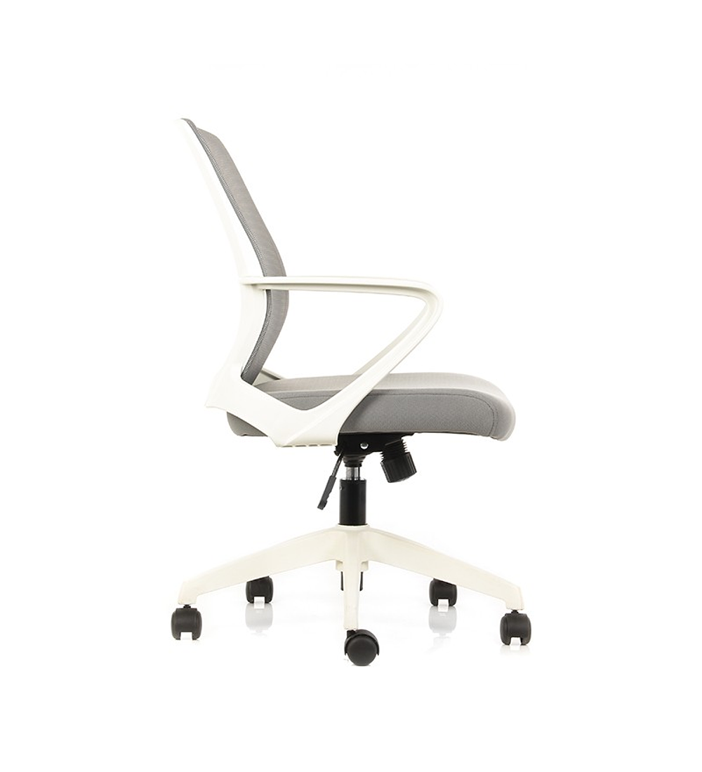 Silla de asiento de espuma de alta densidad tapizado en tela gris, estructura respaldo colorblanco, respaldo en malla color gris y brazos fijos en polipropileno. Mecanismo reclinable conregulación de tensión.