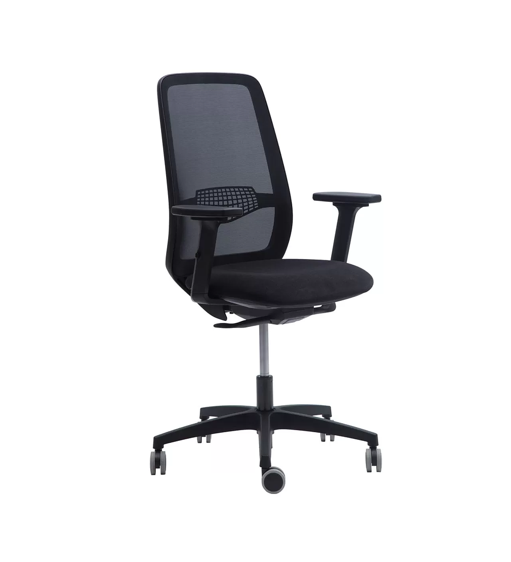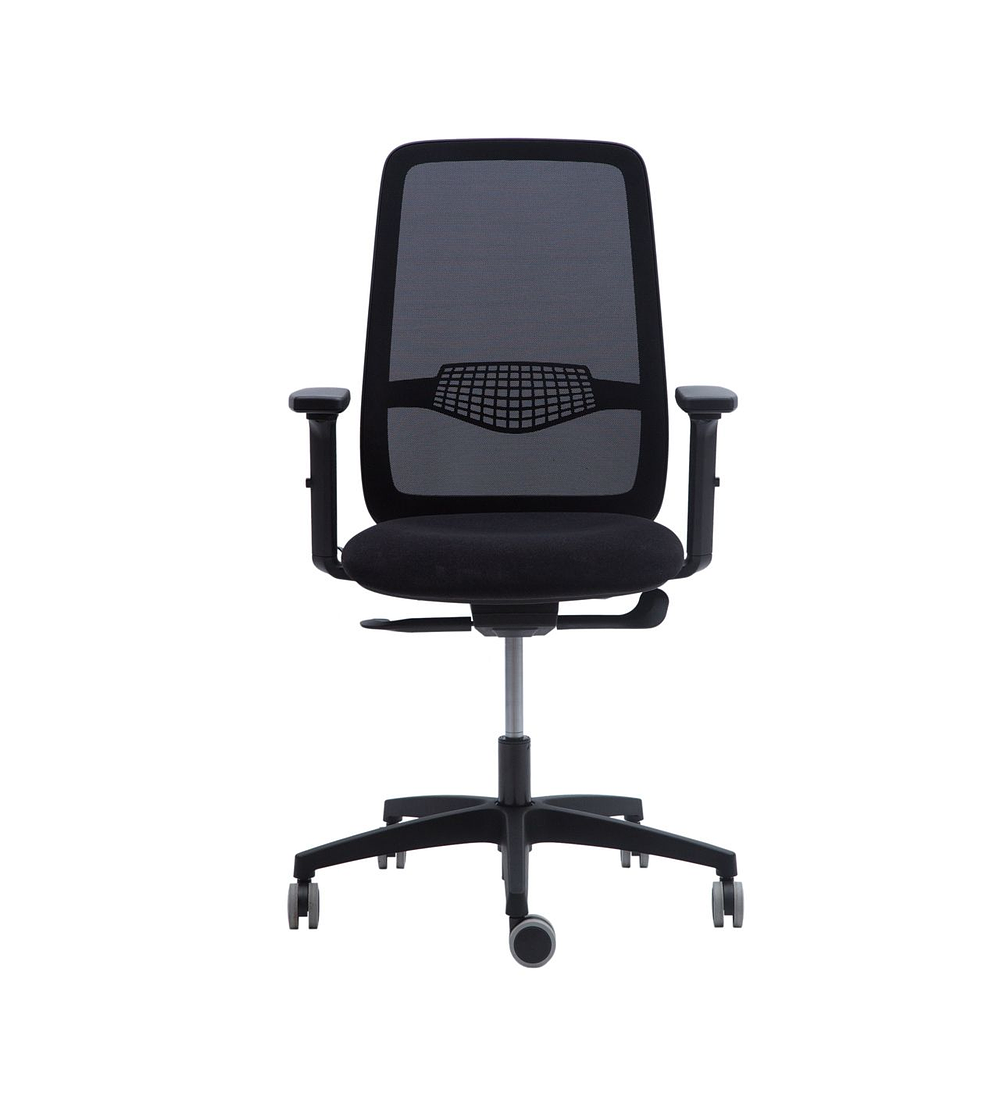 Respaldo alto color negro en malla color a elección. Mecanismo autopesante con 4 posiciones de bloqueo. Apoyo lumbar depolipropileno regulable en altura y asiento tapizado en tela color a elección. Base nylon. PVPN base incluye tapiz Elasticity o tapiz Verona. Adicional Tapiz Nordic o Maderno. Brazos 2D en TPU. Consulta por tu opcional con brazo 3D en PU.