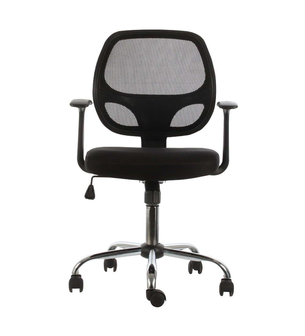 Silla de respaldo en malla negra, asiento de espuma de alta densidad tapizado en tela negra, mecanismo reclinable con brazos fijos de PP y base cromada.
